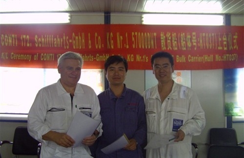 9月18日上午10點(diǎn)18分,我司在1#船臺舉行57000DWT散貨船(船體號:HT037)上臺儀式。德國CONTI公司駐廠項(xiàng)目經(jīng)理Mr. Andrzej Olechnowicz,LR船級社李金龍先生、孫凌峰先生,新韓通重工總經(jīng)理杭友斌先生等出席儀式。