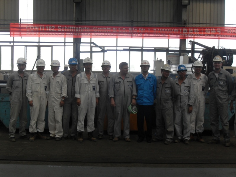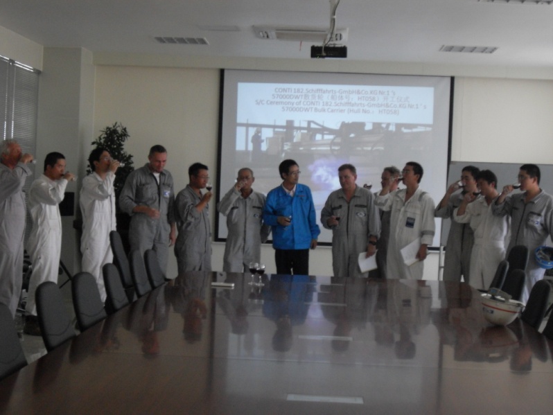 2010年8月12日13:58時,我司為CONTI公司建造的57000DWT散貨輪(船體號:HT058)在新韓通切割中心隆重舉行開工儀式,船東代表:Andrzej Olechnowicz、Krzysztof Franczyk 等人;英國勞氏船級社LR代表:李金龍、孫凌峰、曾廣芳;新韓通重工副總潘學(xué)軍參加了本次儀式。開工點火后,三方代表共同簽署了開工文件。最后所有人員舉杯歡慶,合影留念。