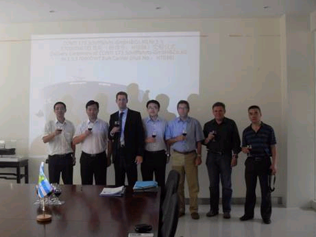 2010年9月7日江蘇新韓通船舶重工有限公司迎來了又一個值得慶祝和紀念的日子—HT038的命名及交船儀式。該57000DWT散貨輪為我司為德國CONTI 船東建造并交付的第二條散貨輪,該船被命名為“POS ALEXANDRIT”. CONTI 船東副總裁奧布梅拉先生和監(jiān)造公司BBG董事霍倫巴克先生和英國勞氏船級社中國區(qū)經理Alan Swinbank 和Alan Williams參加了該儀式并發(fā)表講話。儀式結束后,船東船檢代表等參觀了該船,并給予很高的評價。2010年9月8日下午2:00在新韓通會議室簽訂了該船的交船文件。至此,該船成功交付。