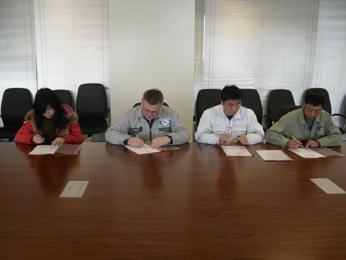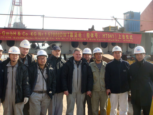 2011年1月7日我公司為德國CONTI船東建造的57000噸散貨輪(HT041)在新韓通船臺順利上臺,該船入LR船級社。儀式結(jié)束后,四方代表共同簽署節(jié)點協(xié)議,并舉杯歡慶,合影留念。