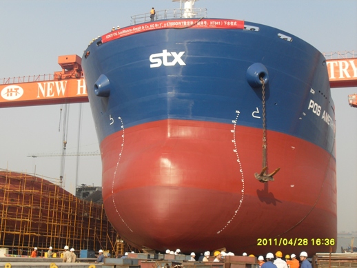 2011年4月28日我公司為德國CONTI船東建造第五艘的57000噸散貨輪(HT041)在新韓通船臺(tái)順利下水,該船入LR船級(jí)社。儀式結(jié)束后,四方代表共同簽署節(jié)點(diǎn)協(xié)議,并舉杯歡慶,合影留念。
