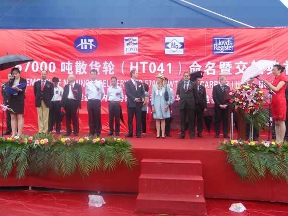 2011年7月14日,我公司為德國(guó)CONTI船東建造第五艘的57000噸散貨輪(HT041)在新韓通碼頭順利舉行命名及交船儀式,該船入LR船級(jí)社。
