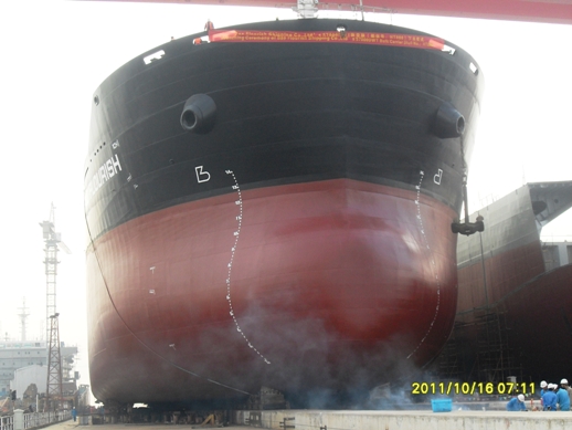 10月16日清晨06:58,新韓通為寶源國(guó)際船東建造第五艘57000噸散貨輪(船體號(hào):HT086)在二號(hào)船臺(tái)順利下水,寶源船東駐廠代表馬如云、DNV船檢黎新、新韓通副總經(jīng)理周義慶參加本次下水儀式,該船入DNV船級(jí)社。