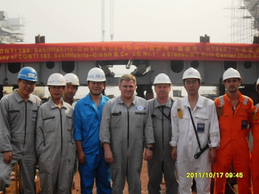 10月17日上午09:18,新韓通為CONTI船東建造的第八艘57000噸散貨輪(HT059)在二號船臺舉行上臺儀式,BBG現(xiàn)場經(jīng)理ANDRZEJ、LR代表李金龍、新韓通副總經(jīng)理于剛出席了本次上臺儀式,該船入LR船級社。