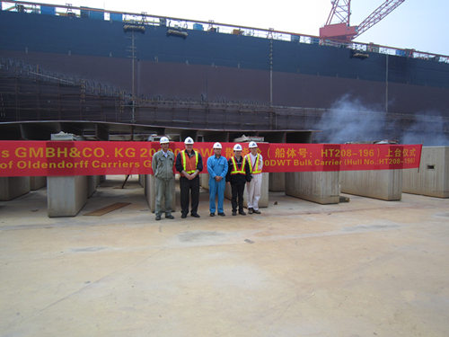 2015年3月30日上午10:28分,新韓通為船東建造的208000噸散貨輪(HT208-196)成功舉行上臺儀式,新韓通總經(jīng)理助理圣衛(wèi)兵及船東船檢參加本次儀式。