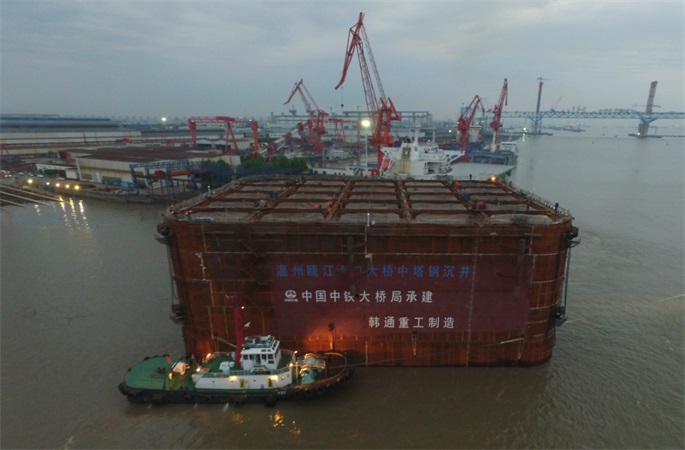 2017年5月16日4:38分,我司承接的中鐵甌江大橋鋼沉井順利下水。該沉井將通過14000噸半潛駁浮運(yùn)至溫州甌江大橋工程現(xiàn)場下沉。并在錨地下沉起錨后于17日上午4:30拖航去溫州,甌江大橋沉井平面形狀為圓角矩形,鋼沉井總高 59m,鋼沉井井身平面尺寸為 66m×55m,井身材料為 Q345C 鋼材,總重18000噸。