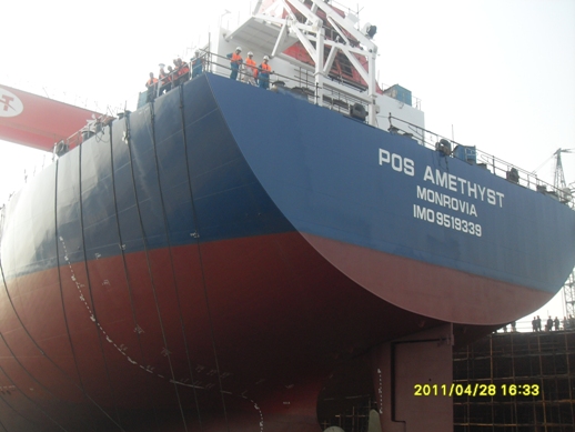 2011年4月28日我公司為德國CONTI船東建造第五艘的57000噸散貨輪(HT041)在新韓通船臺(tái)順利下水,該船入LR船級(jí)社。儀式結(jié)束后,四方代表共同簽署節(jié)點(diǎn)協(xié)議,并舉杯歡慶,合影留念。